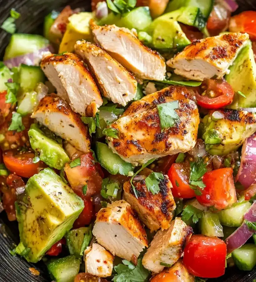 Avocado provides emulsified natural fats that create creaminess without processed ingredients, while lime juice stabilizes color and enhances brightness. Lean chicken adds protein structure, and crisp vegetables introduce textural contrast. The balance of fat, acid, and seasoning ensures a well-rounded flavor profile. At approximately 350 calories per serving, this salad offers nutrient density with satisfying macronutrient balance.