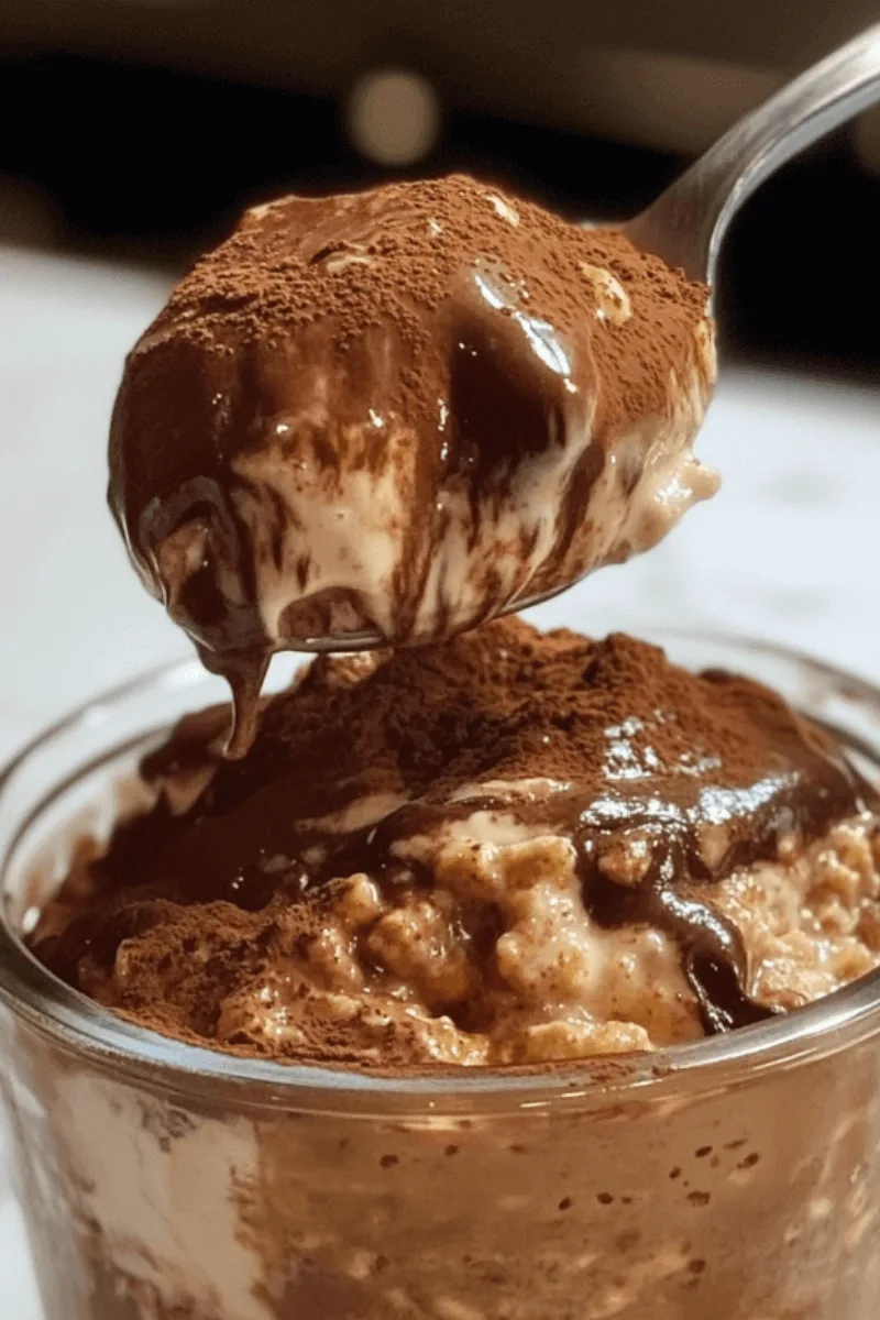 In a serving glass or jar, layer the soaked oats and protein yogurt mixture. Finish with a generous dusting of cocoa powder to mimic traditional tiramisu.