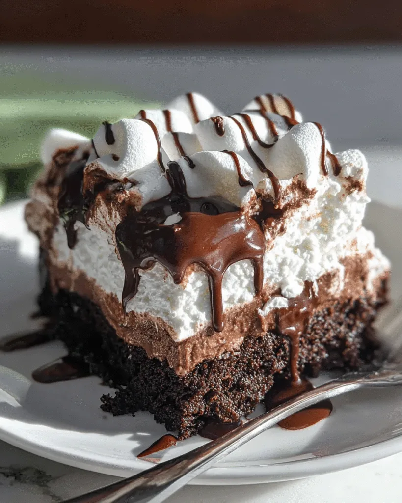Indulge in the delightful Marshmallow Chocolate Poke Cake, a dessert that promises to be the star of any occasion! This recipe features a rich chocolate base infused with a luscious chocolate ganache filling, ensuring that every slice is a decadent, moist experience for chocolate lovers. Topped with a fluffy, airy marshmallow whipped cream and a decorative chocolate drizzle, it perfectly balances intense cocoa flavors with a light, nostalgic sweetness.