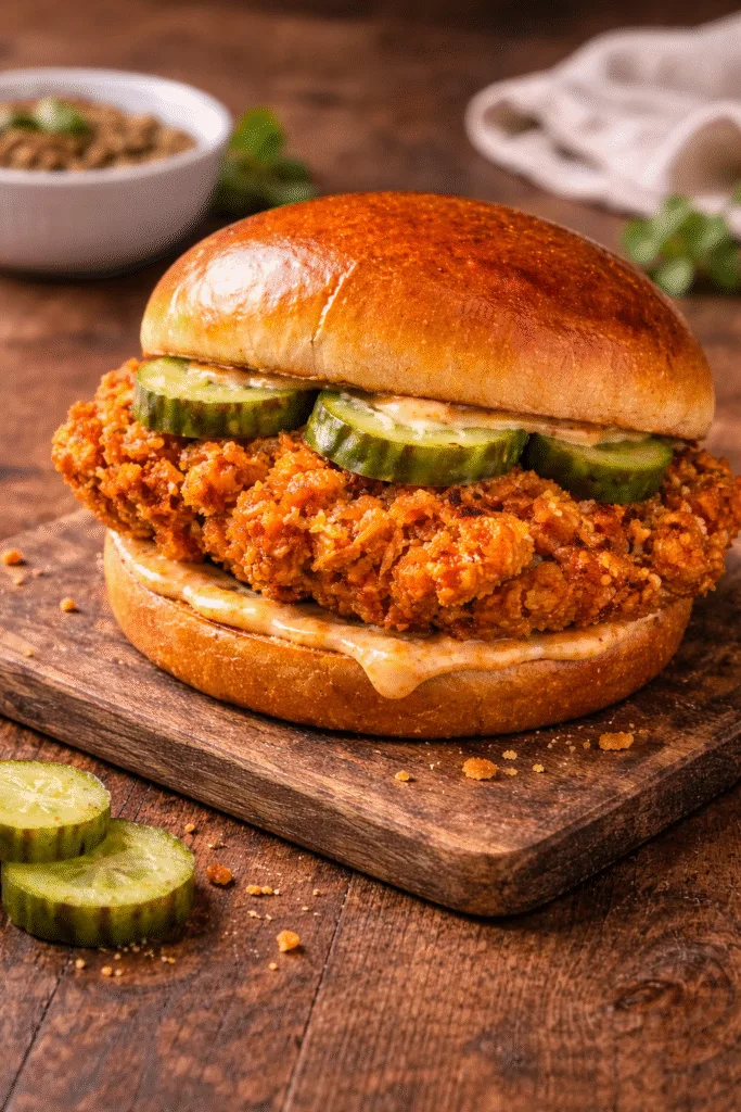 - Assemble the sandwich – Spread sauce, add chicken, top with pickles, and finish with the bun